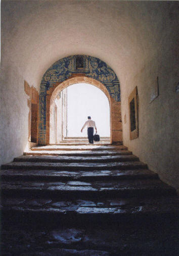 worn-out steps, inside of a high and arched tunnel, gives access to